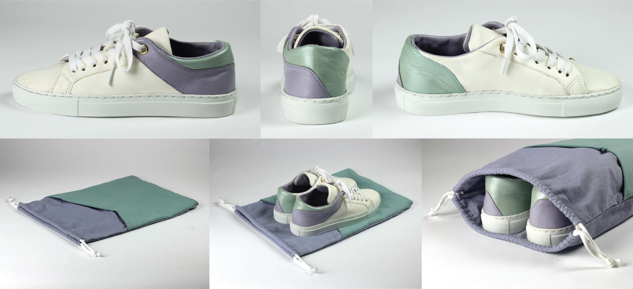 The design language translates to a drawstring shoe bag featuring a magnetic front pocket.